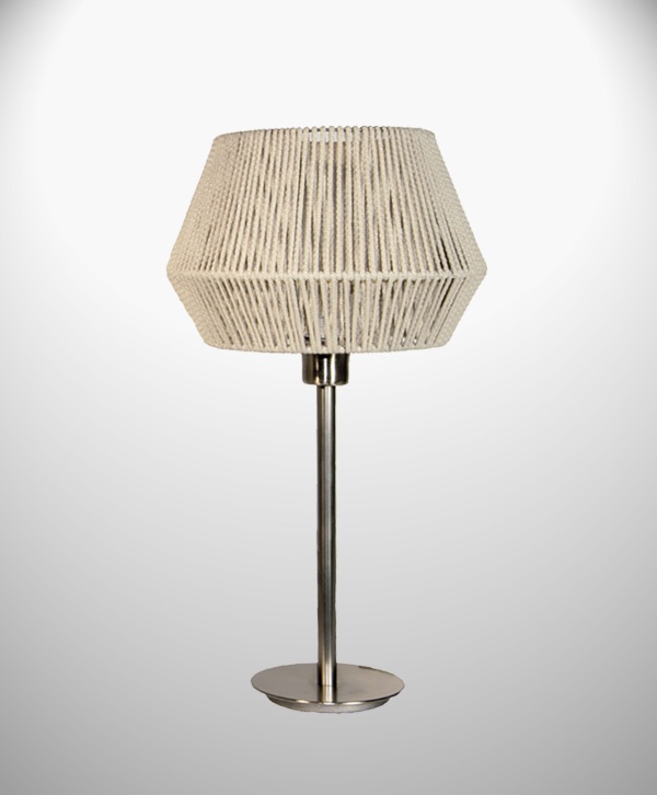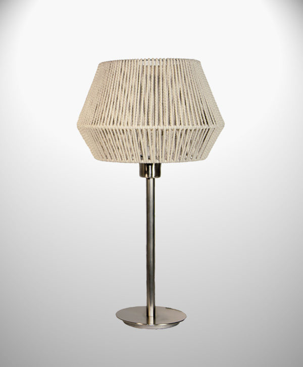 Lámpara de mesa con pantalla realizada en tejido artesanal. Pie platil.